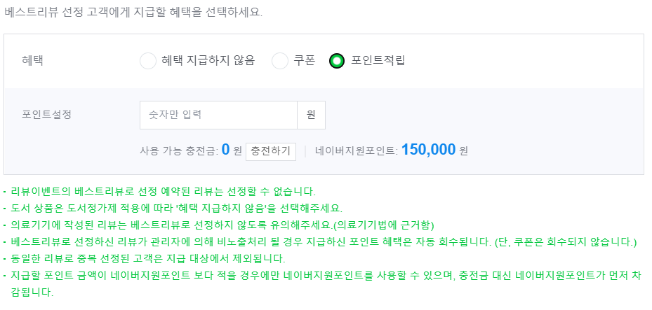 실제로 후기 중에 좋은 후기를 써주시는 감사한 분들이 있을 겁니다. 베스트 리뷰로 선정했을 때 쿠폰/포인트로 혜택을 지급할 수 있는데 포인트로 골라서 지급하면 성장지원 포인트가 지급됩니다.