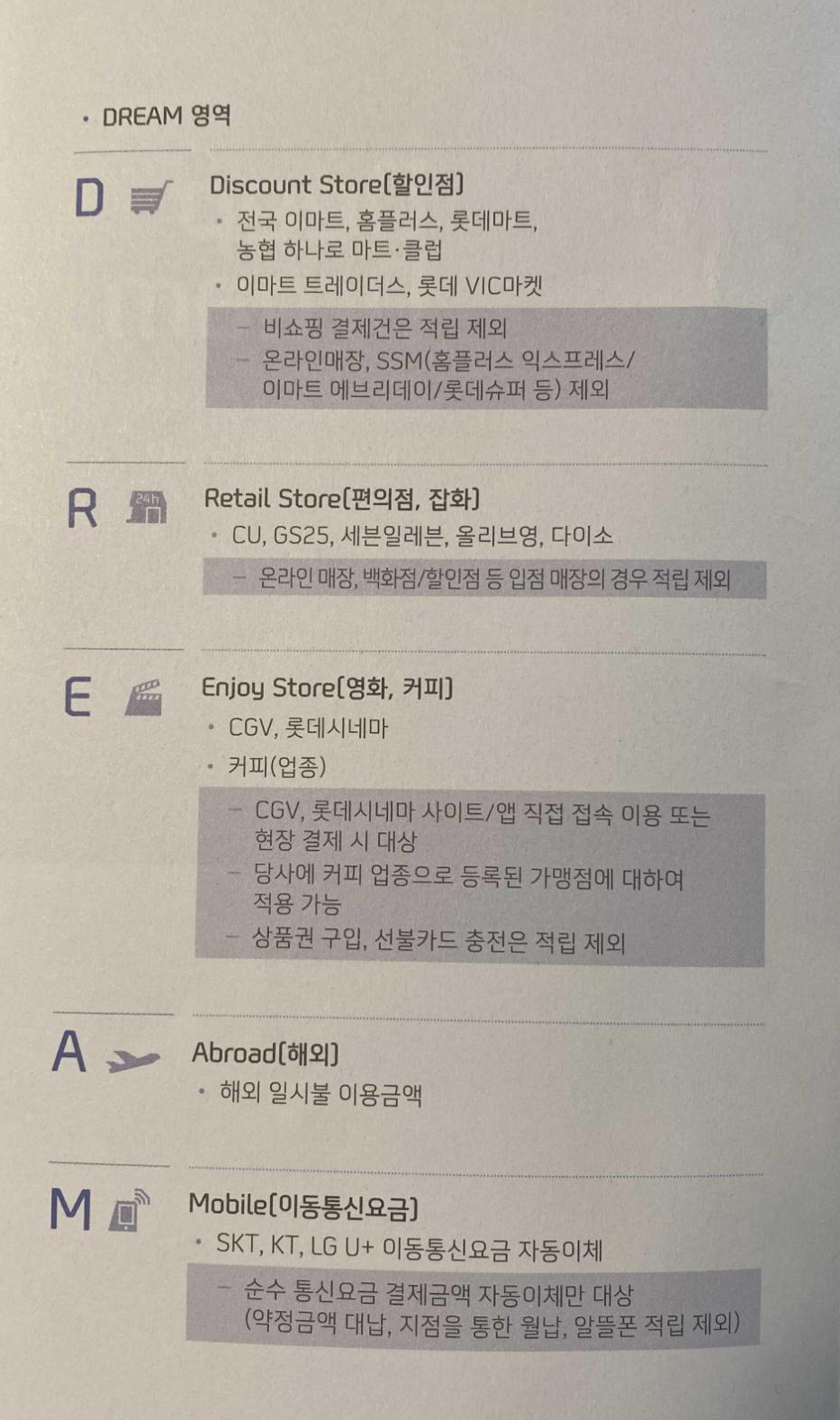 1. D R E A M 분야 중에서 가장 많이 쓴 분야 1개에 한해 3.5% 적립! 우리는 해외 구매대행이라 해외 결제가 많은데, A가 Abroad라서 해외 일시불 결제 금액에 대해 3.5% 적립을 받을 수 있다. 거의 이것 때문에 선택했다고 봐도 무방하다.
