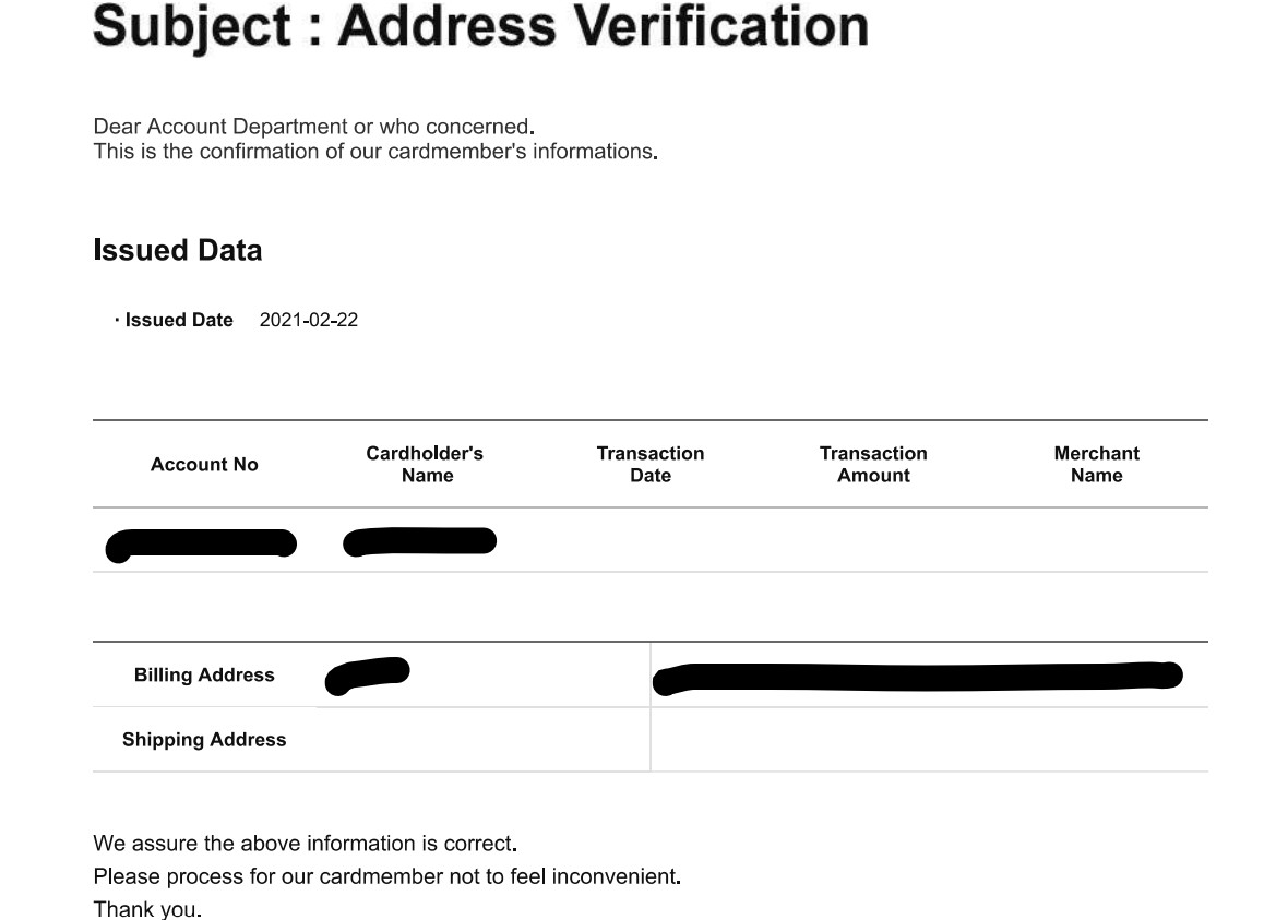 billing Statement 혹은 영문 주소 확인서/ 영문 회원 확인서를 작성해 메일로 보내달라고 한다.