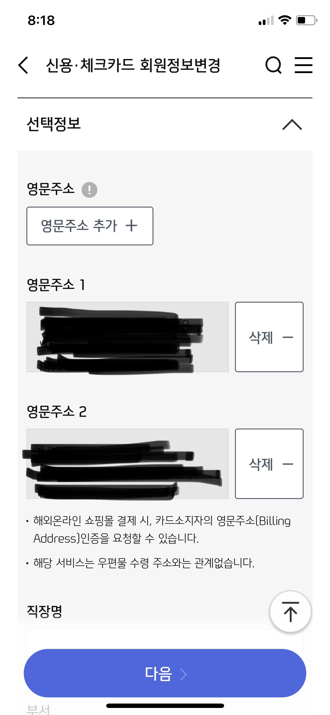 참고로 우편번호는 자신이 쓰는 해외 배대지의 우편번호를 입력하면 됩니다. 보다 정확하게는 자신이 해외 결제사이트에 billing address라고 입력한 곳의 우편번호를 카드사에도 입력해야 합니다.