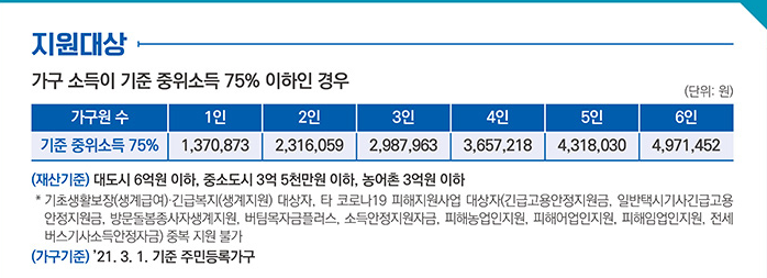 2. 가계소득이 현재(21년 1월~5월) 기준 중위 소득 75% 이하인 경우이어야 합니다.