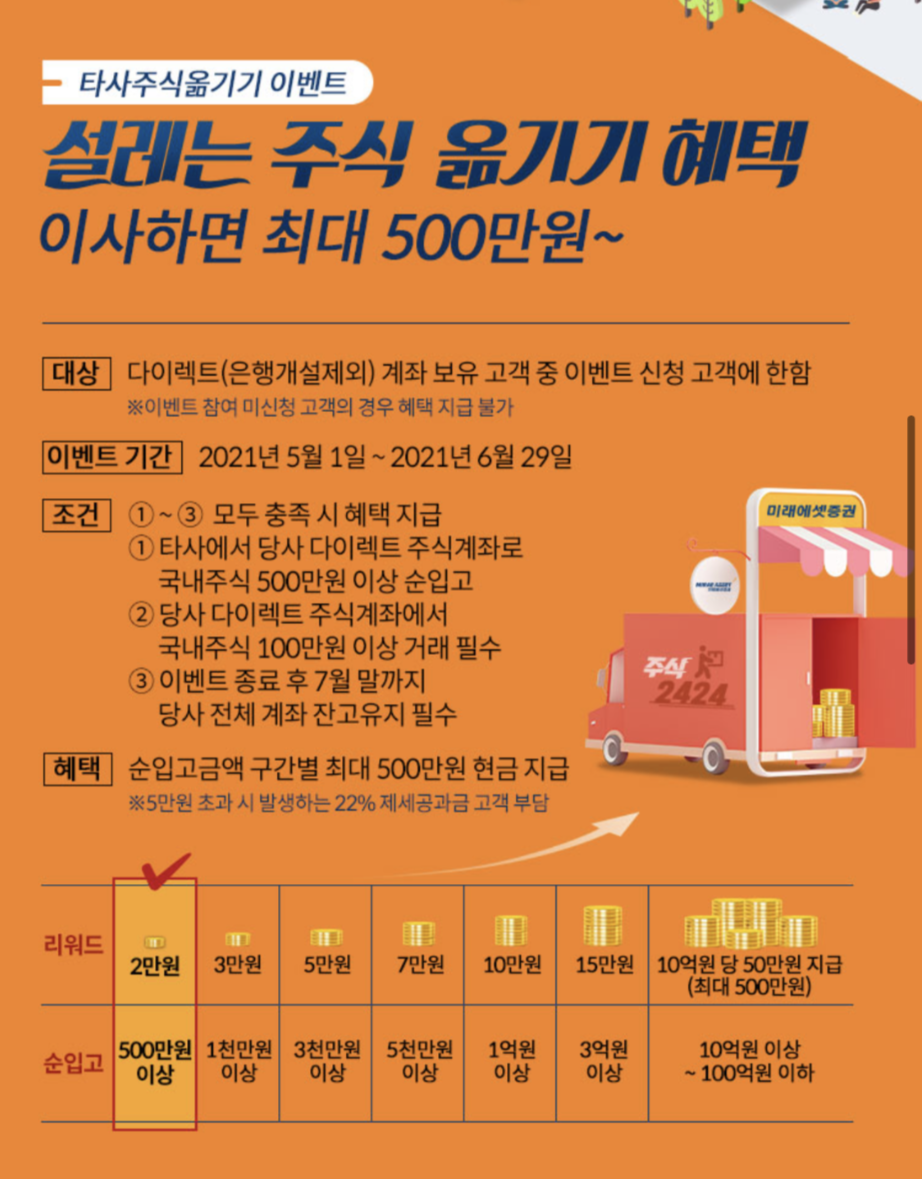 미래에셋 타사 주식 입고이벤트가 다른 점은 500만원부터 준다는 점이다.