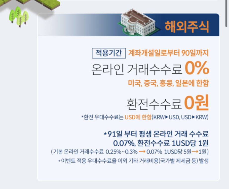 3. 해외주식: 계좌 개설일로부터 90일까지 온라인 거래 수수료 0%, 환전 수수료 0원
